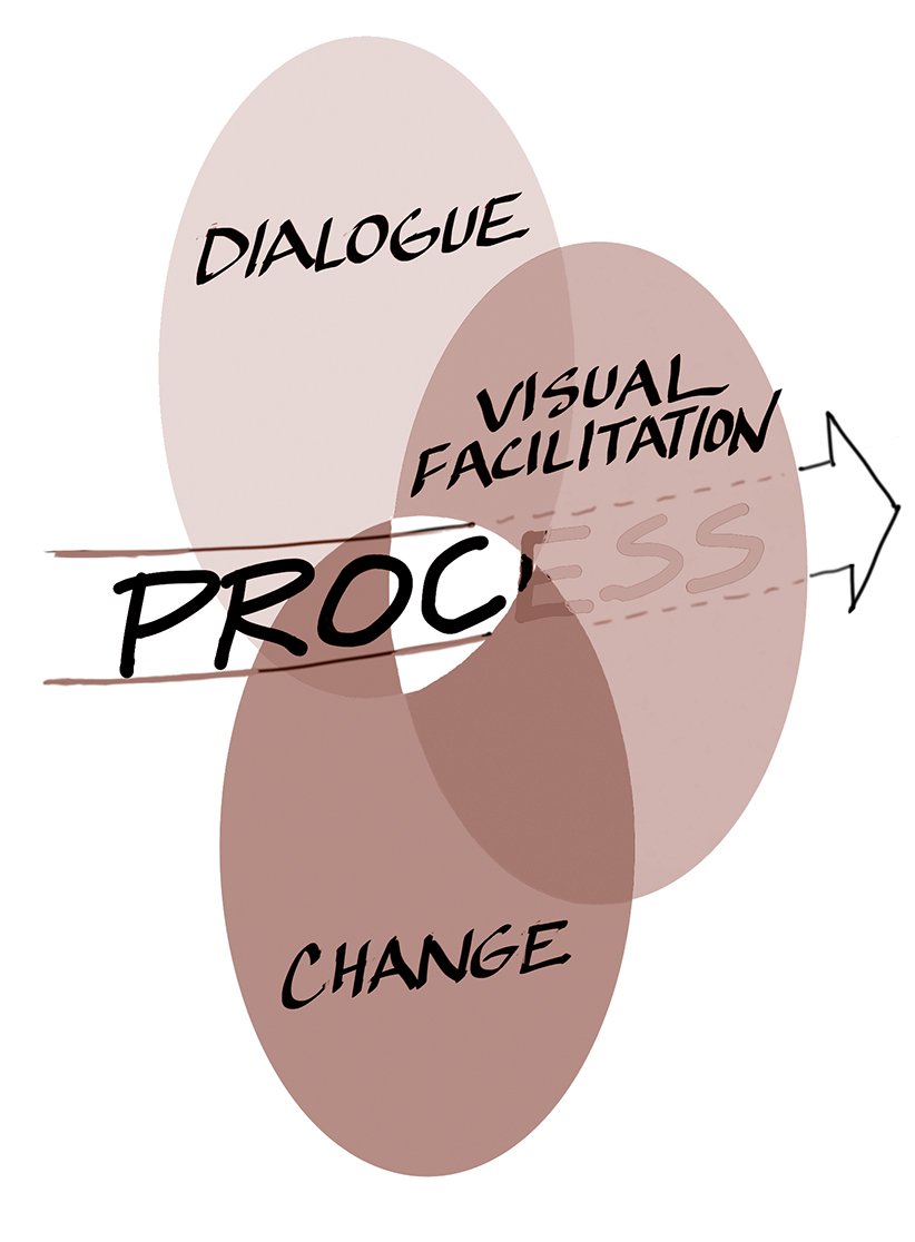 So we are writing about a future we hope to shape, one where the utility and excitement of visual facilitation can integrate with what practitioners are learning about the importance of dialogue, as well as with the practices emerging from a growing field of change consultants.